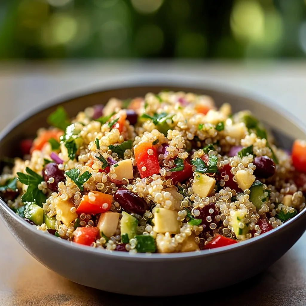 Mediterranean Quinoa Salad is a delicious and nutritious dish made primarily from cooked quinoa mixed with various fresh vegetables such as cucumbers, tomatoes, red onion, bell peppers, olives, and herbs like parsley or mint. Often drizzled with olive oil and lemon juice dressing; it boasts vibrant flavors typical of Mediterranean cuisine while being rich in protein due to its main ingredient—quinoa! This versatile dish can serve as a side or main course and fits well within vegetarian diets too!