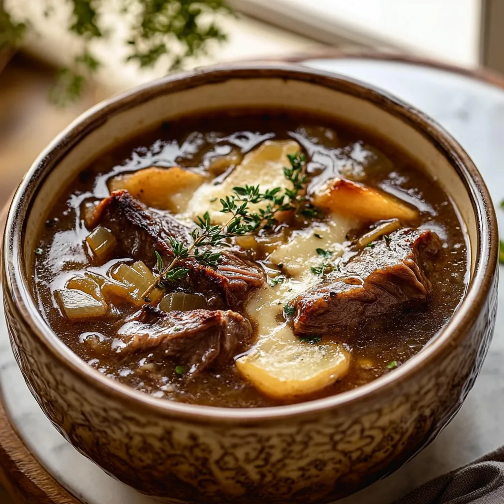 A rich and hearty soup with tender short ribs, caramelized onions, and a savory broth, topped with melted cheese and toasted bread. Perfect for cozy dinners or special occasions!